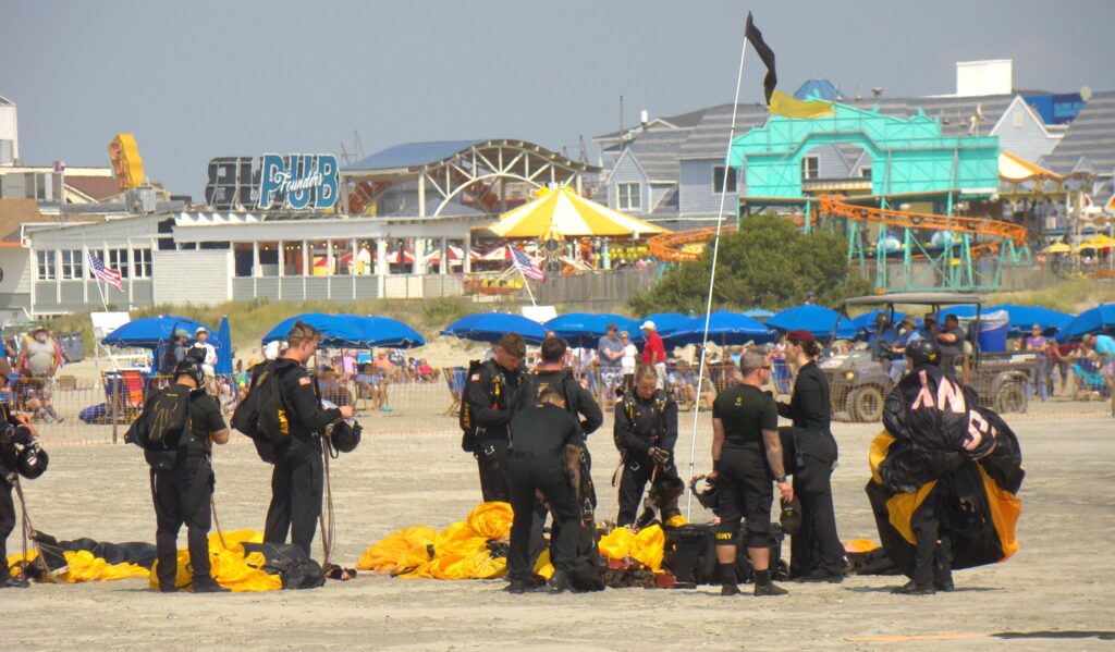 The show was kicked off by the Army’s Golden Knights Parachute Team, which performed a targeted jump, landing on the beach near Morey’s Ferris wheel.
