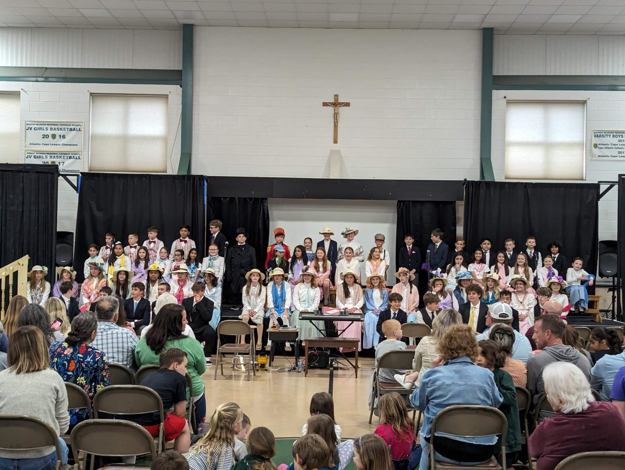 In addition to the gallery, the stage was adorned with magnificent works of art, creating a backdrop reminiscent of scenes from the 1950s Broadway show, The Music Man. Ms. Walls, as part of the music curriculum, assigned her students from 4th to 8th grade to showcase a musical review based on this cherished Broadway production.