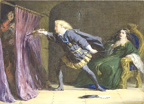 In Hamlet, the meddling character Polonius hides behind a screen to spy on Hamlet, who discovers his presence. Thinking Polonius is his uncle Claudius, whom he wishes to kill, Hamlet plunges his sword through the screen, killing Polonius.