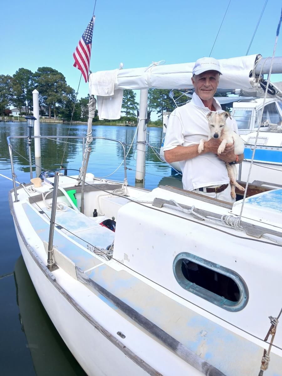 John Lebeau and his dog, Shelly, aboard the Vent d’Ete.