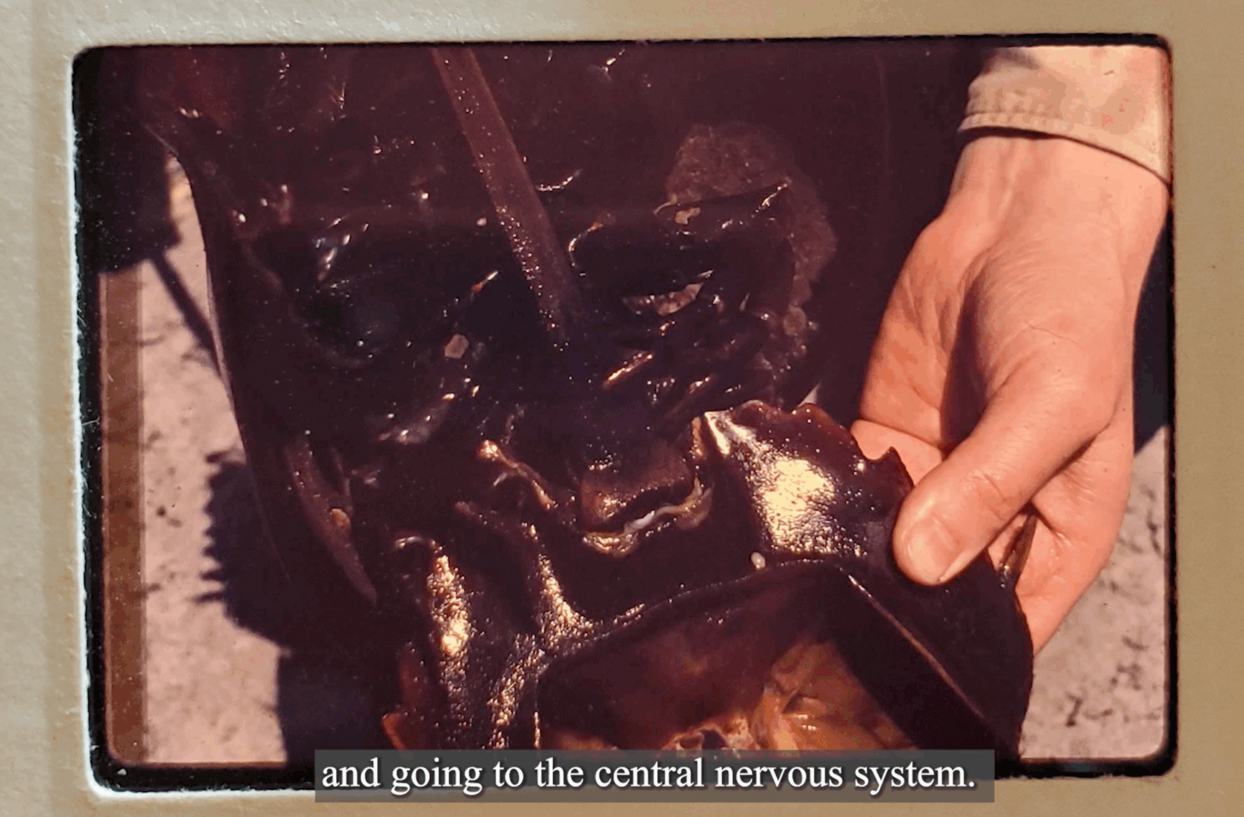 But here he is, fumbling with old slides. The projector won’t play along. The opening scene is dark. In front of the camera is a living room in a cozy mid-century styled home. There’s more fumbling. Leah, finally, gets the projector to work, and the presentation, from one of the world’s leading experts on horseshoe crabs, begins. It’s one of a few huzzah moments of clarity sprinkled throughout the 11-minute short film.