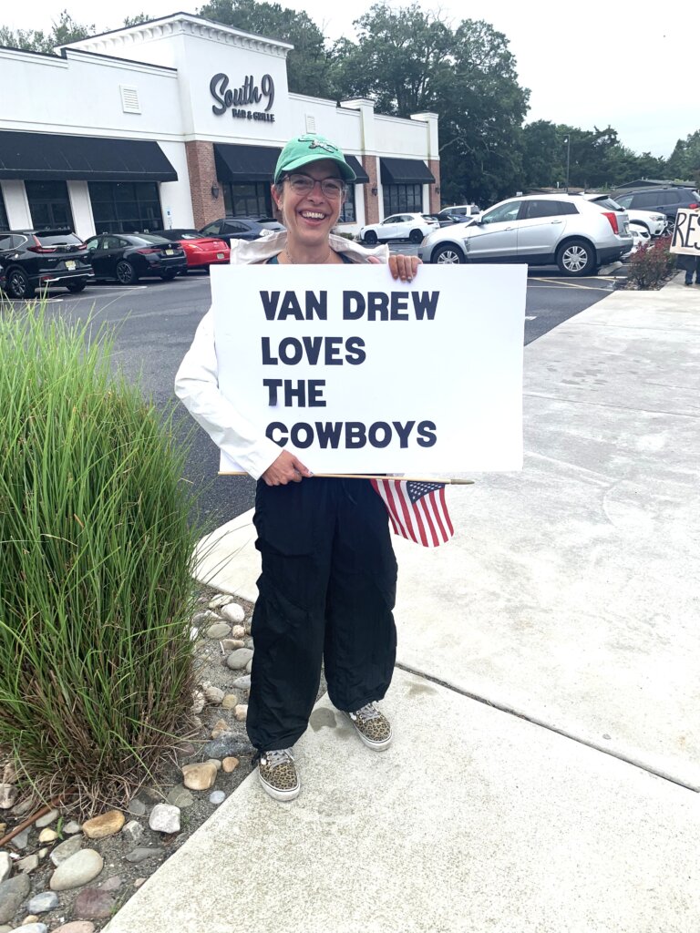 “Van Drew Loves the Cowboys” read a sign held by Sharon Bybee of Mays Landing.